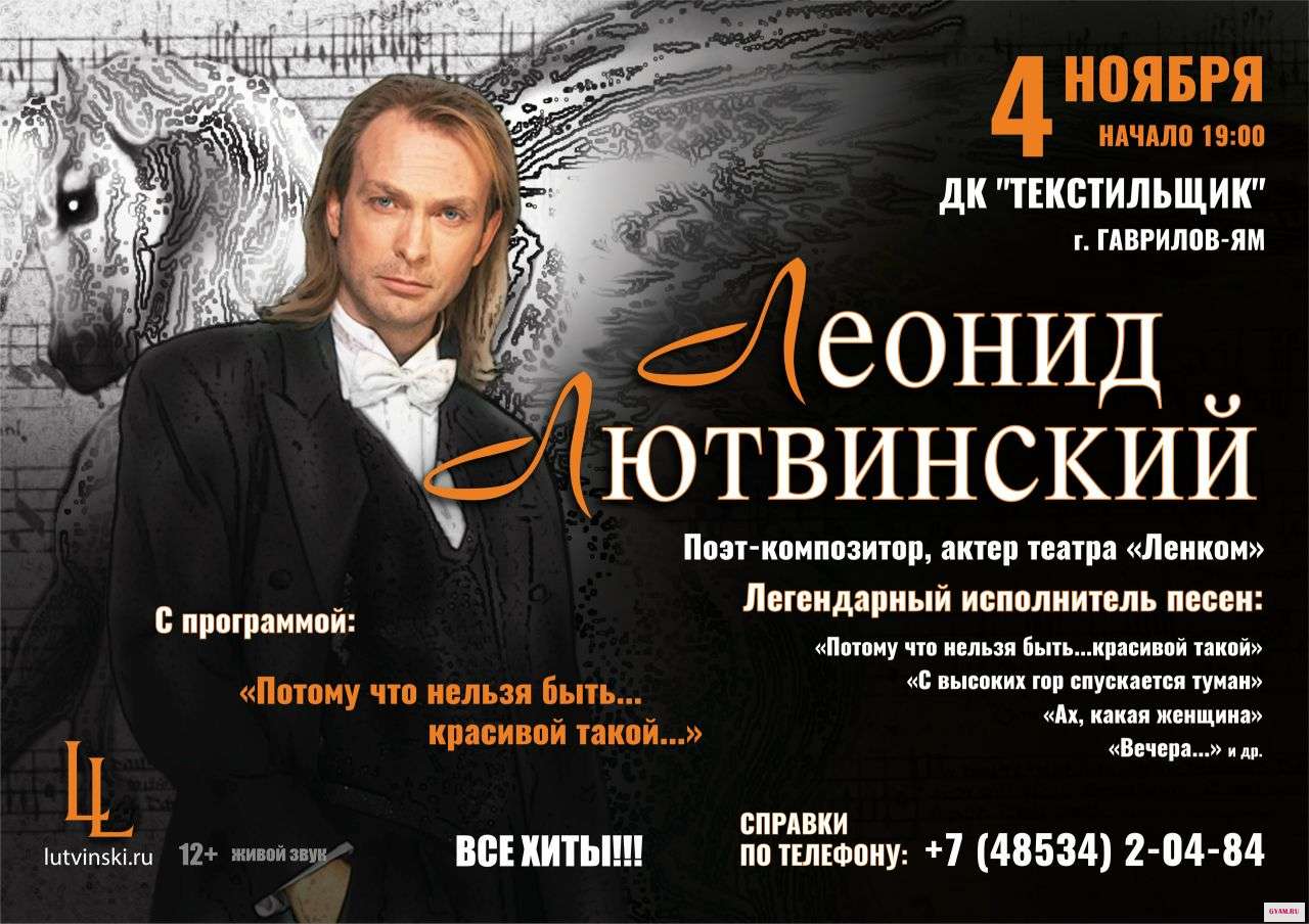 04 ноября в г. Гаврилов-Ям состоится концерт легендарного солиста группы "Белый орел" Леонида Лютвинского, который работал в группе в пик ее популярности с 2000 по 2007г. Прозвучат хиты: "Как упоительны в России вечера", "Потому что нельзя быть красивой такой. . . "и многие другие, очень душевный концерт. Продолжительность 1ч40мин. Начало 19:00ч. Всем рекомендую сходить, провести замечательный вечер и получить массу положительных эмоций. Тел. для справок +7 (48534) 2-04-84. Стоимость билетов 500 руб.
