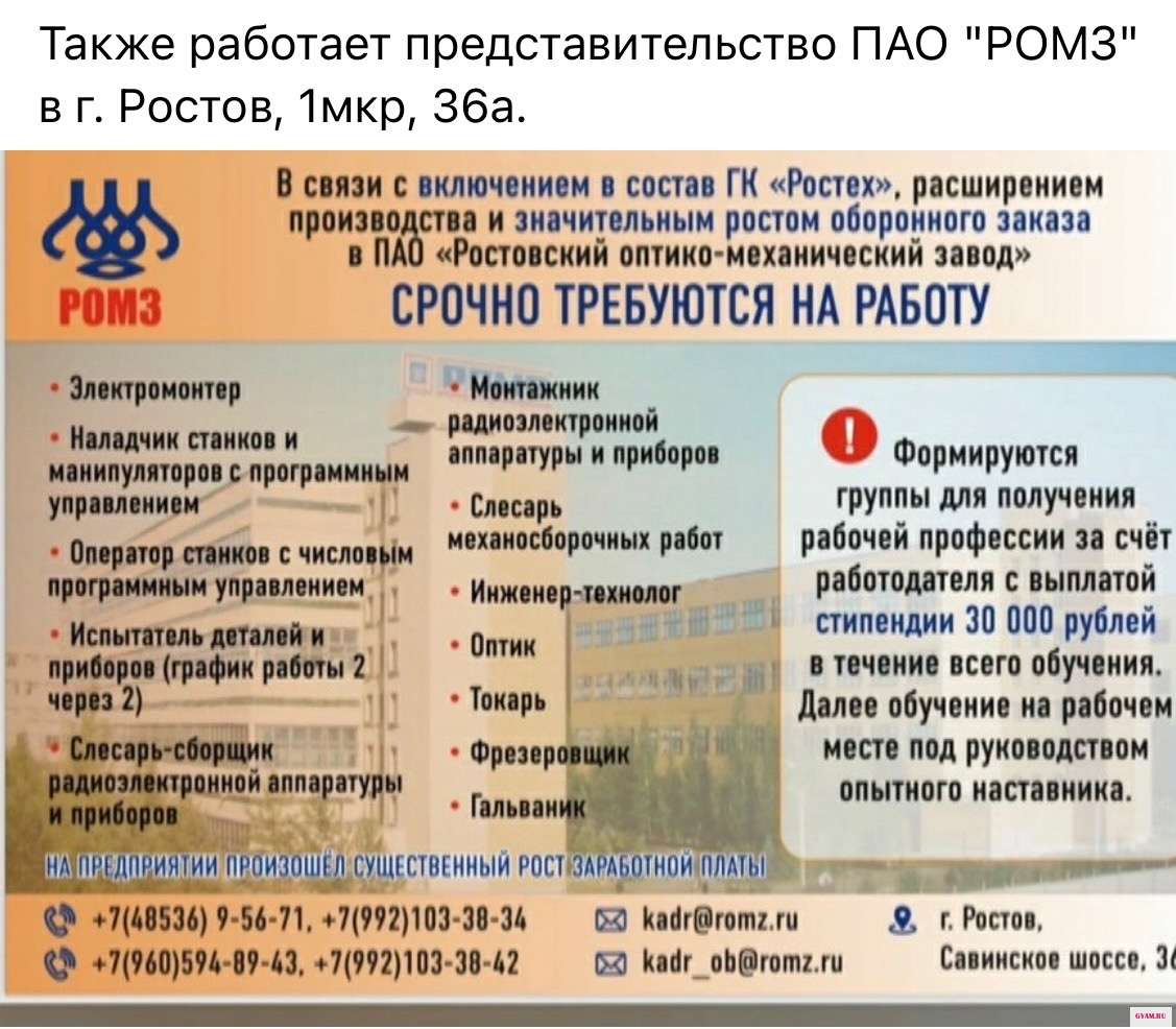 Внимание ‼️ Внимание ‼️ Уважаемые соискатели ‼️ ПАО «РОМЗ» с 17 июня 2024 начинает осуществлять доставку работников на предприятие по адресу: Ярославская обл., город Ростов Великий, ул. Савинское шоссе, д. 36.