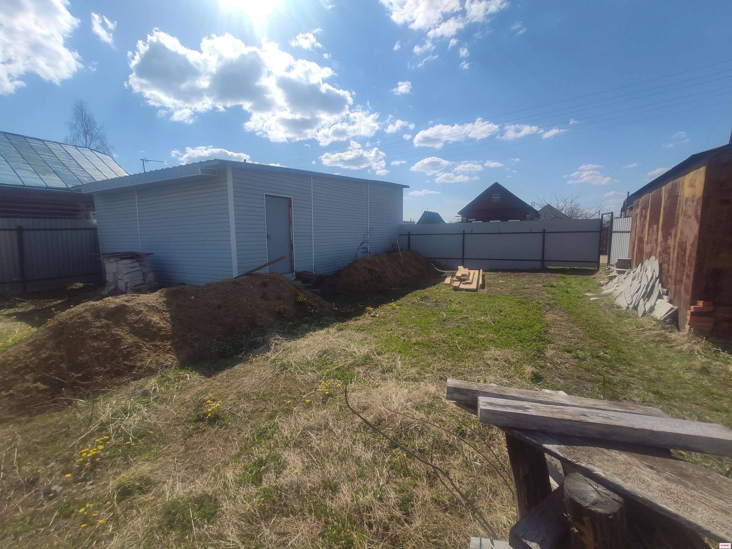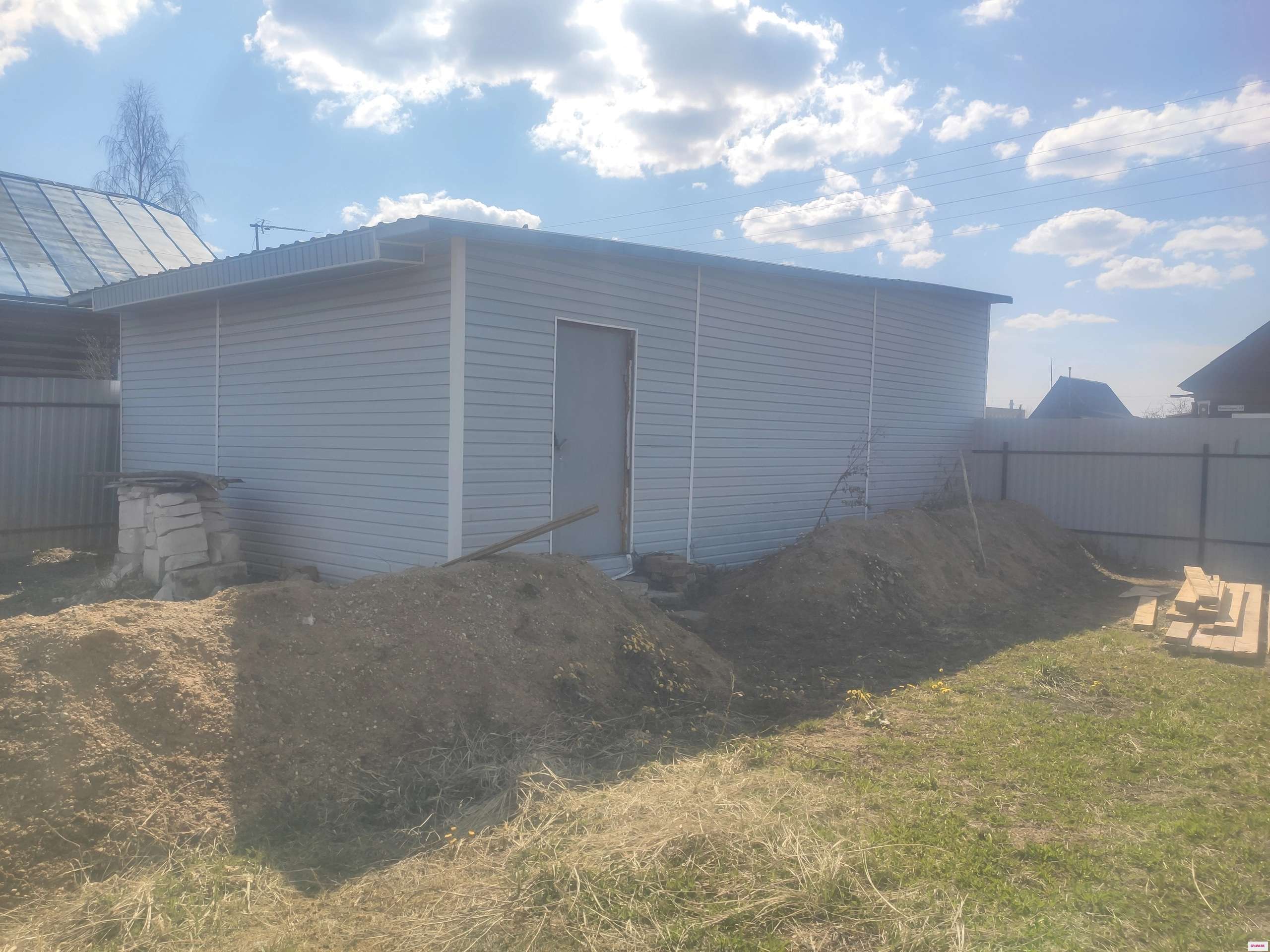 1). Гараж из пеноблоков обшитый сайдингом, размер 6, 2* 8 м, высота ворот 2, 8 м;