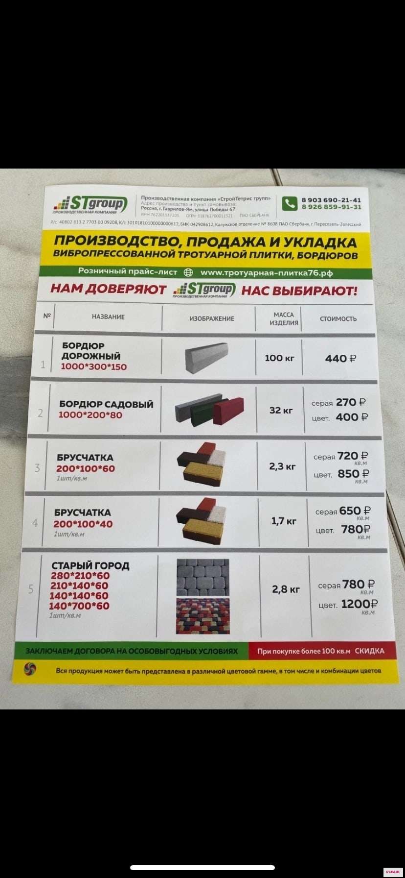 Производство тротуарной плитки "STgroup " предлагает для вашего внимания прайс на все виды плитки, по очень выгодным ценам : адрес победы 67, номер телефона +7 (903) 690-21-41 Артур