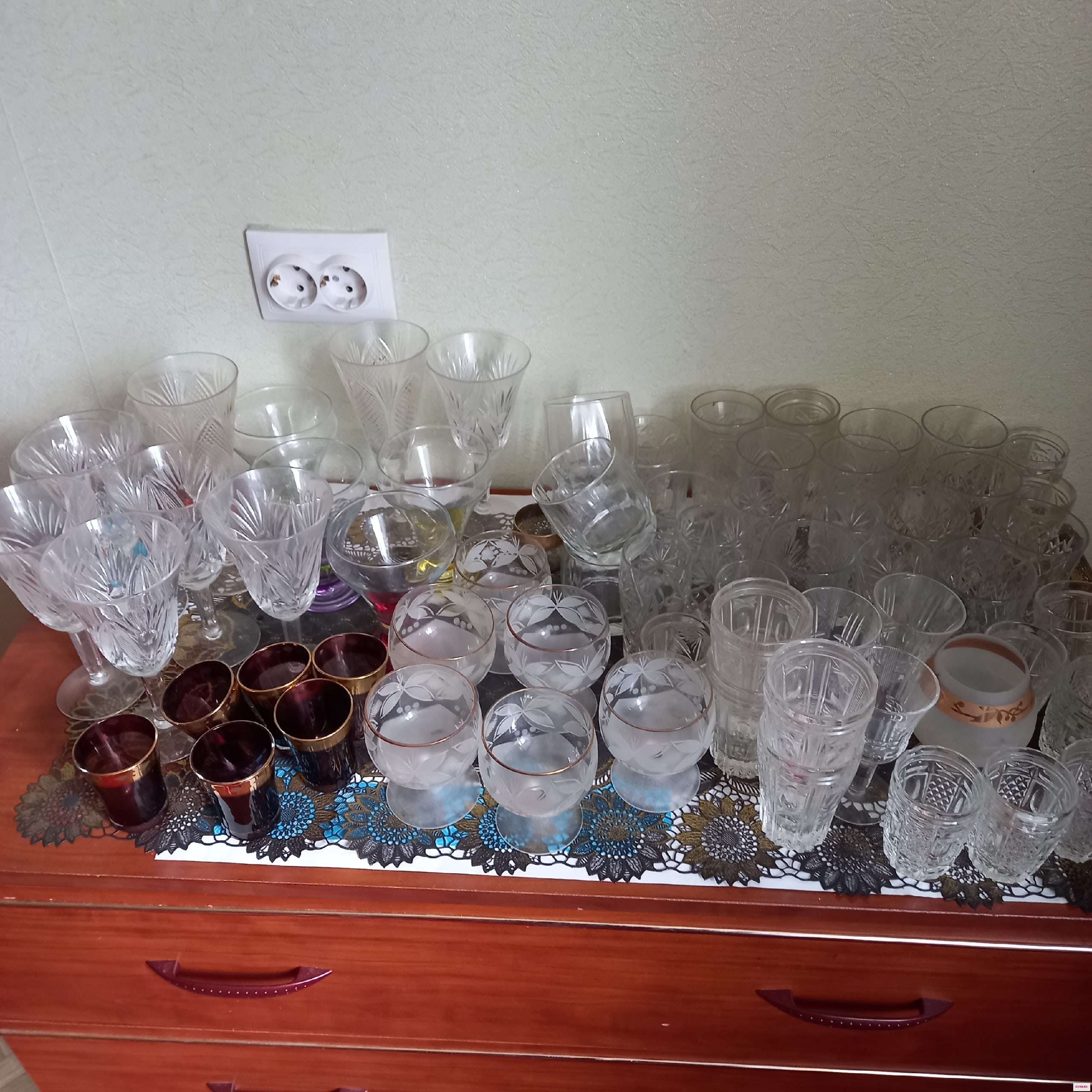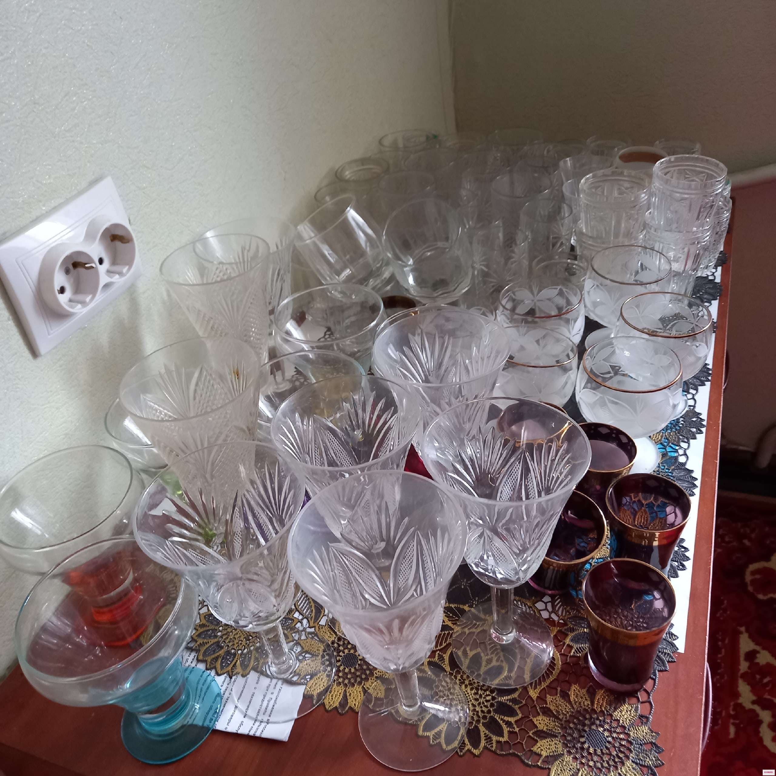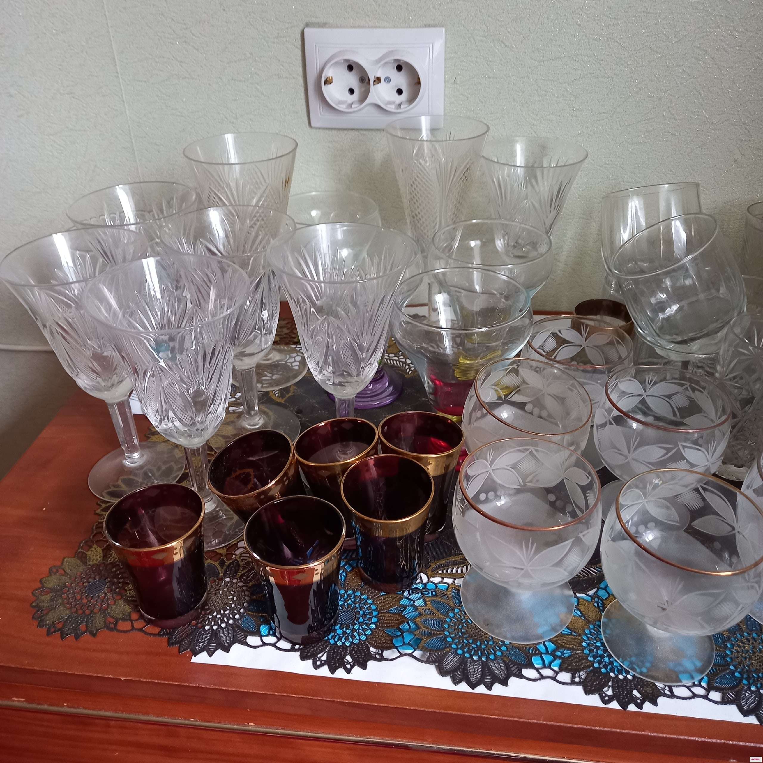 Чайные и кофейные сервизы, тарелки, стопки хрустальные, стаканы, фужеры.