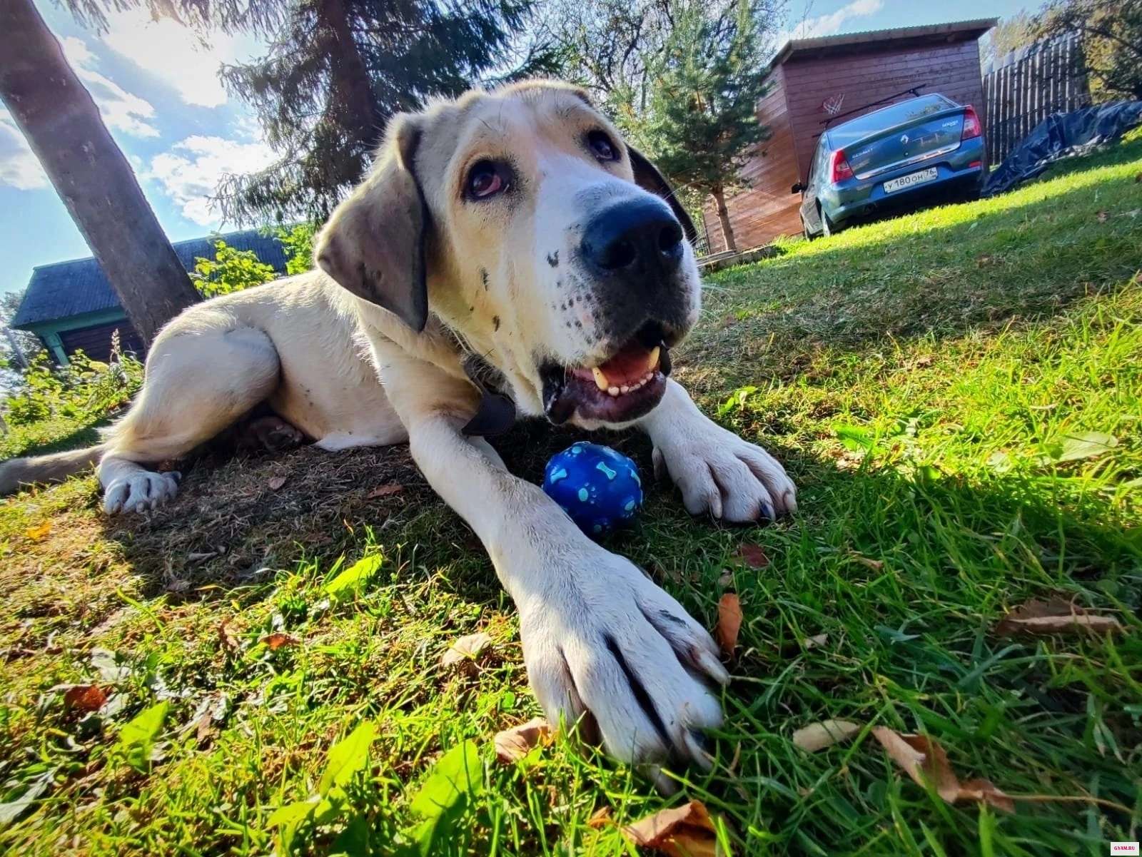 Альфа - метис алабая, разница в некупированных ушах и хвосте. Возраст примерно год-два, крупная, играет с деревенскими детьми, очень человекоориентированная и ласковая, но свое предназначение собаки знает- территорию охранять может.