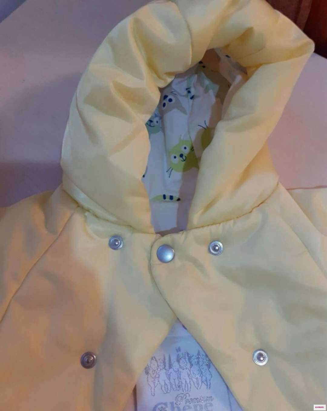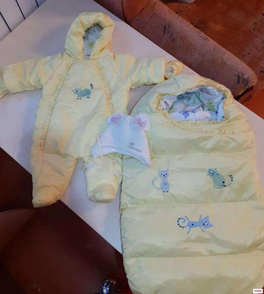 Цвет ярко-лимонный (не ядовито-желтый), ярче чем на фото. Комплект нарядный, лёгкий и очень тёплый (натуральный гусиный пух), можно на выписку, можно на подарок.