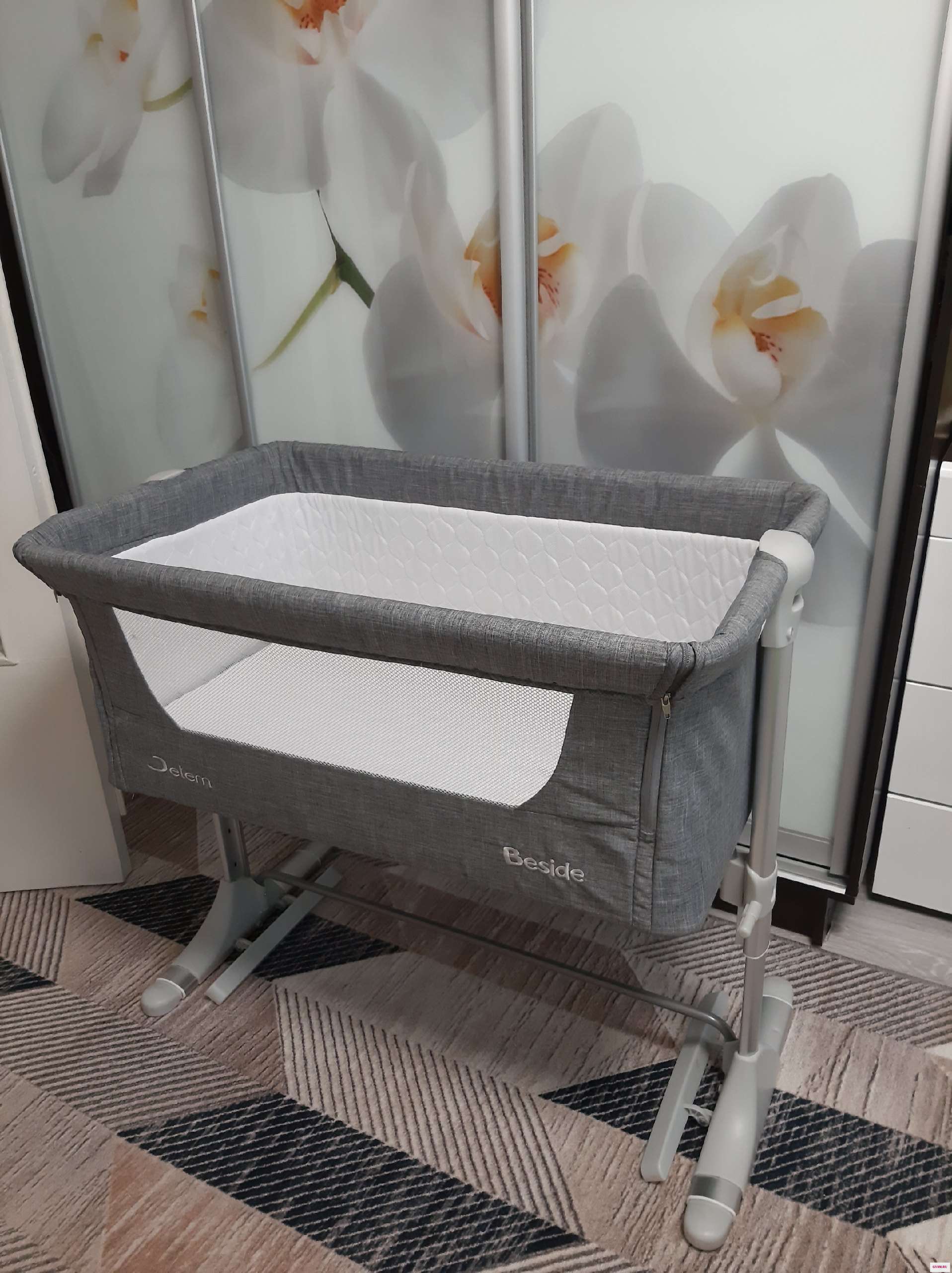 Передняя стенка опускается, есть 4 режима высоты, так же есть уровень наклона (от срыгивания). Есть возможность укачивания. Кровать складывается в компактную сумку. Фото по запросу, писать в лс.