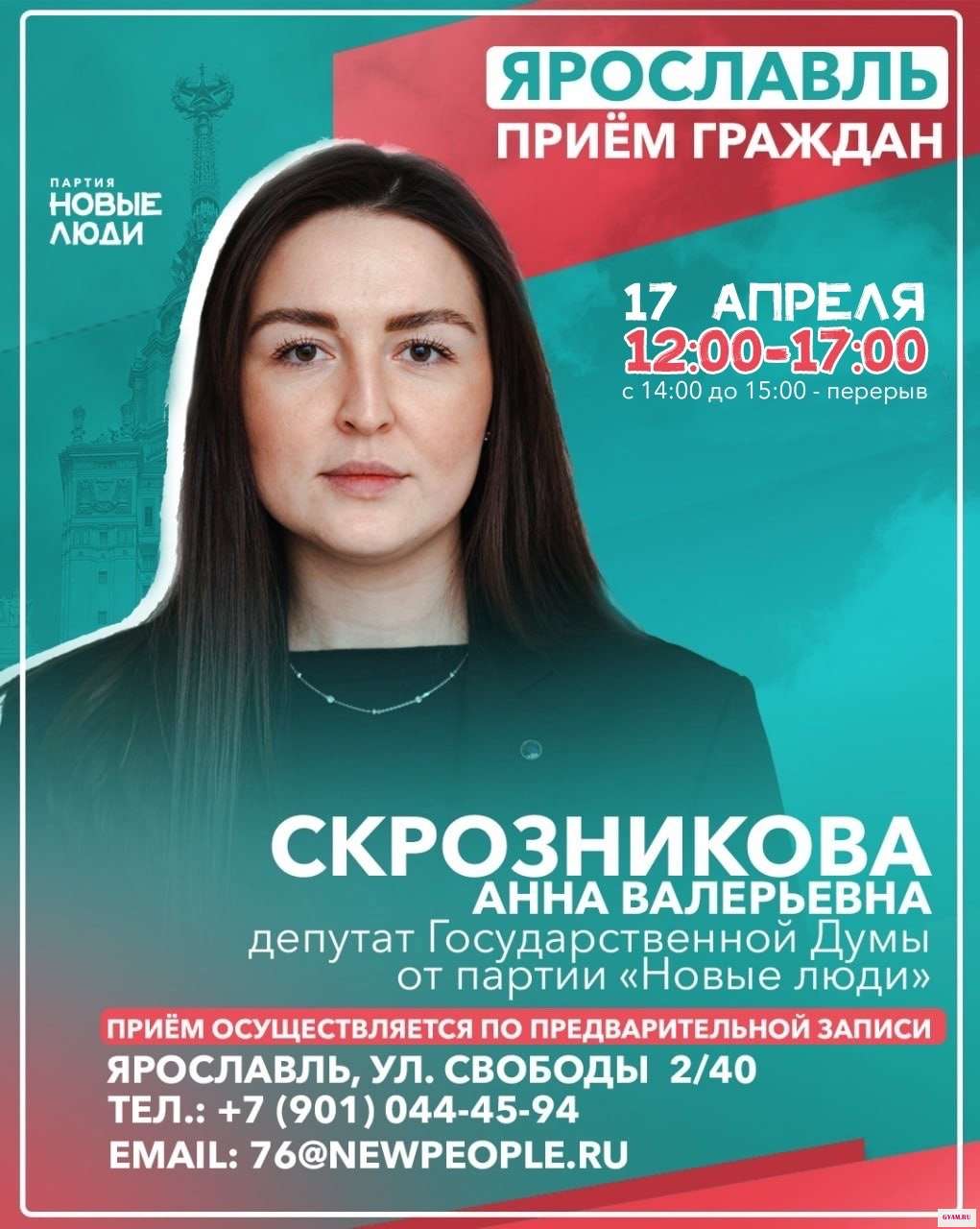 17 апреля, в Ярославле с 12:00 до 17:00 в нашем офисе по адресу ул. Свободы 2/40 при участии депутата Государственной Думы от партии «Новые люди» [id140080286|Скрозниковой Анны Валерьевны], состоится приём граждан.
